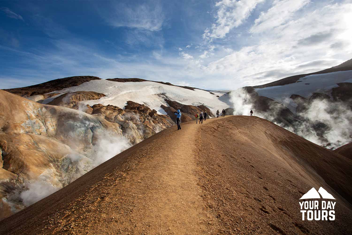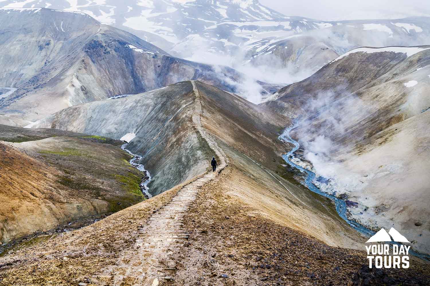 Icelandic highlands, where the Kerlingarfjöll mountain range is located, is a unique place, completely remote and uninhabited. Here you will be able to admire a picturesque landscape of 10,000-year-old rhyolite mountains with snowy caps and steam rising from the geothermal springs below. It is a magical place to spend your day out in the wild.
